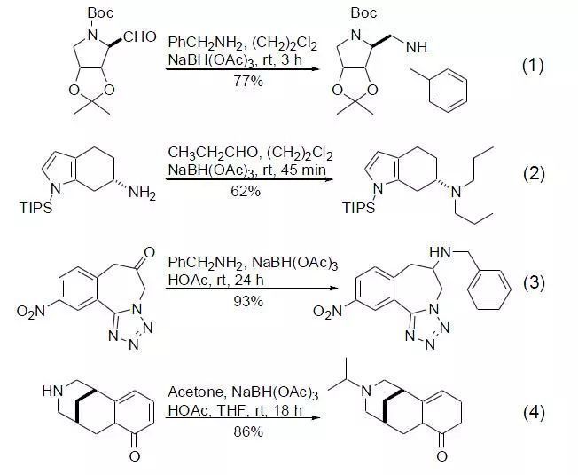三乙酸基硼氫化鈉在現代有機化學中被用作一種選擇性的、較溫和的還原試劑。它主要被用作NaBH3CN 的替代物對醛和酮進行還原胺化反應[1]。由于該試劑中只有一個氫負離子,所以用量可以得到相對嚴格的控制。比NaBH3CN 優越的是它不需要對反應體系的酸堿度進行調節,由于沒有氰酸根的存在也增加了安全性[1]。目前文獻使用情況顯示,該試劑在還原胺化反應中的應用日趨增加。該試劑可以影響醛和酮與伯胺和仲胺的還原胺化反應[2,3],但是酮為底物時需要催化量的乙酸來增加反應的速度,或者在乙酸中反應[4~6]。ClCH2CH2Cl是該反應的最佳溶劑,反應的速度最快。該反應也可以用THF 和MeCN 為溶劑,但反應速度有所下降,特別是后者。該反應一般在室溫下進行,醛與胺的反應可以在數分鐘之內可以完成,酮與胺的反應則需要數小時。大多數情況下產物的產率在中等至較高的水平 (式1~式5)。