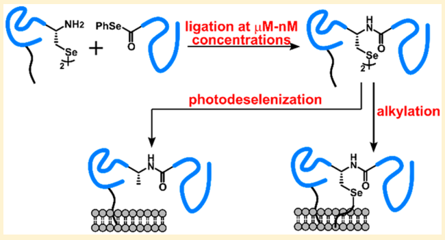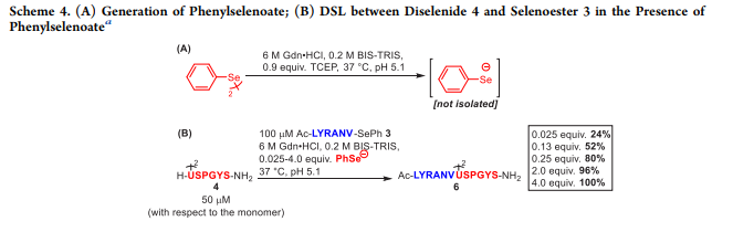 在這篇文章的開始,作者首先比較了兩個常見的肽段連接反應NCL和聯硒-硒酯耦聯DSL這兩種反應的底物濃度和反應動力學。他們發現NCL反應雖然能夠在50μM的濃度能夠發生連接反應,但是連接反應的速度非常的慢。而對于DSL反應,這個反應不需要引發,本身的動力學很快,但是對于500μM以下的肽段都無法自發的發生反應了。所以本文想在這兩個反應的基礎上進行優化,開發出具有很快的反應速度,并且反應需要的濃度比較低的肽段連接反應。