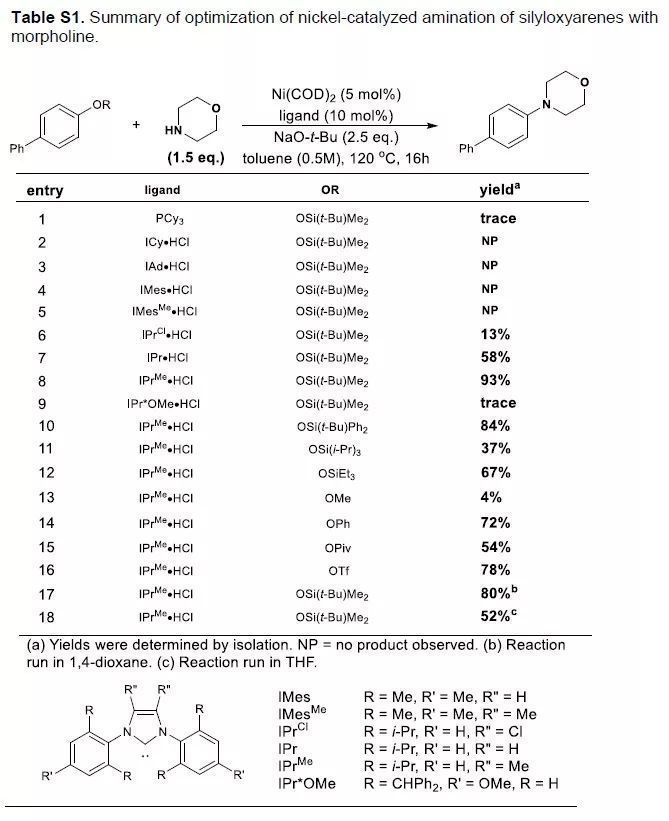 首先,作者以嗎啉和二甲基叔丁基硅氧基取代的聯苯為底物,對反應條件進行了篩選(Table S1)。通過對一系列富電子的膦配體和氮雜環卡賓配體進行篩選,作者發現以IPrMe為配體可得到產率為93%的胺化產物。而且,在該反應條件下,苯甲醚和芳基鹵代物(Br, F)等其他苯酚衍生的芳基親電試劑只能獲得較低的產率。