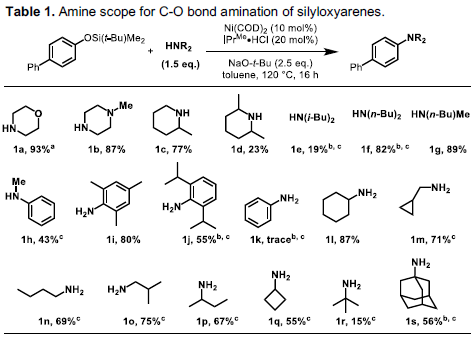 芳香胺是生物活性分子中廣泛存在的結構單元,因此,開發新型芳基 C-N鍵的構建方法對苯胺類衍生物的合成具有重要意義。苯酚衍生物具有豐富的保護基種類和反應活性,可作為鹵代芳烴的替代物與親電試劑進行偶聯反應,從而合成芳香胺類化合物,比如Wenkert曾利用鎳催化C-O鍵活化實現了芳基甲基醚與胺的偶聯反應(J. Am. Chem. Soc. 1979, 101, 2246)(Scheme 1B)。然而,芳基硅醚卻極少作為偶聯反應的親電試劑。由于硅醚保護基具有一定穩定性,并且能進行后續轉化,因此開發新型芳基硅醚參與的偶聯反應具有很強的吸引力。