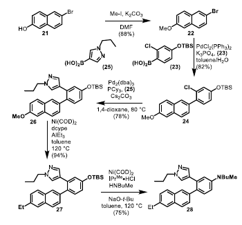 最后,作者對含有多種官能團的芳基化合物的順序性偶聯反應進行了研究(Scheme 3)。以化合物21為底物,其通過甲基化、鈀催化的Suzuki偶聯、鎳催化芳基甲基醚的烷基化以及鎳催化芳基硅醚的氨化得到目標產物28。這一結果充分證實了新方法的可控性及其在化合物后期修飾方面的潛力。