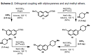 鑒于該反應對芳基甲基醚的良好耐受性,作者考慮通過控制反應條件實現芳基甲基醚或硅醚的選擇性活化。在以17為底物的正交偶聯實驗中,作者通過配體調控實現了分子中硅醚和甲基醚的選擇性和順序性胺化和烷基化,殊途同歸地合成了化合物20(Scheme 2)。