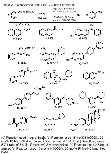 完成反應條件優化之后,作者考察了胺類底物的適用范圍(Table 1)。嗎啉、哌嗪或哌啶等環狀胺均可以與芳基硅醚發生偶聯反應。增加胺的空間位阻會導致反應的產率降低。一級或二級苯胺類衍生物及脂肪伯胺也可以中等到優異的產率獲得相應的目標產物。而在之前報道的芳基甲基醚的胺化反應中,脂肪伯胺類化合物很難與相應的甲基醚發生偶聯。