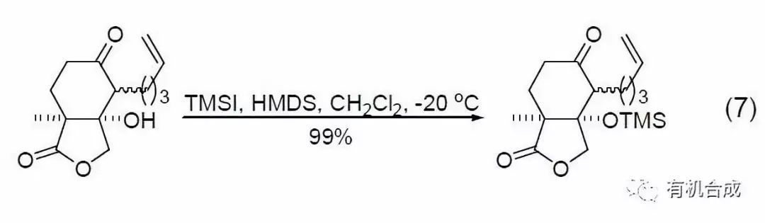 雖然TMSI很容易將醇轉(zhuǎn)化成相應(yīng)的三甲基硅醚,或者將羰基轉(zhuǎn)化成為相應(yīng)烯醇的三甲基硅醚 (式7)[13,14],但是由于TMSI 操作和價(jià)格上的原因,完全可以用其它廉價(jià)和方便的試劑所替代。