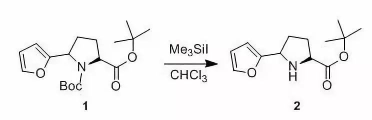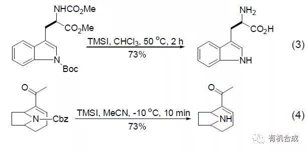 在中性的無(wú)水條件下Me3SiI在CHCl3或CH3CN中除了能脫除Boc外,也能斷裂氨基甲酸酯、酯、醚和縮酮。通過(guò)控制條件可以得到一定的選擇性。