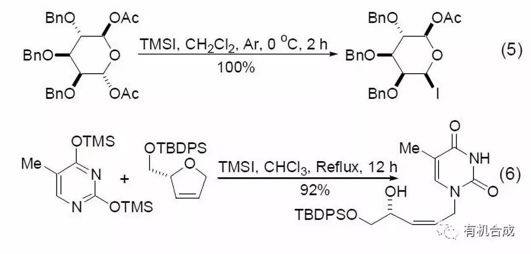 有多種方法可以將醇羥基轉(zhuǎn)化成為碘,但是使用TMSI進(jìn)行的轉(zhuǎn)變條件之溫和以及效率之高,使之在糖化學(xué)中具有重要的地位。TMSI高度選擇性地將糖分子中縮醛的羥基轉(zhuǎn)化成為碘,而保持其它官能團(tuán)不發(fā)生變化 (式5)[9,10]。過(guò)量的TMSI與環(huán)醚化合物反應(yīng)是獲得碘化物的另外一種非常有價(jià)值的反應(yīng)。有時(shí)用這種方法生成的碘化物可以不經(jīng)分離,直接用于下一步的烷基化反應(yīng) (式6)[11,12]。