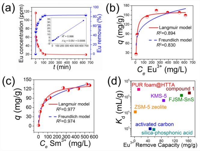 ▲Figure 2. (a) The kinetics curve of Eu3+ removal by 1. Inset: the plot of t/qt vs t. Equilibrium data for Eu3+ (b) and Sm3+ (c) ions adsorptions of 1 fitted with the Langmuir and Freundlich isotherm models. (d) Comparison of the removal capacities for Eu3+ and Kd values of 1 with those of other reported materials.
