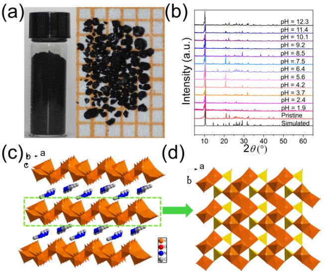 ▲Figure 1. (a) Photographs of the crystals of 1 in a vial (about 3.0 g) and spread on a paper without selection. (b) Simulated and experimental PXRD patterns for the pristine 1 and 1 after soaking in solutions with various pH values. (c) Packing of 1 viewed along the b-axis. (d) View of a layer of [V3O7]nn- parallel to the ab plane; [VO4] tetrahedron and [VO5] pyramid are represented in yellow and orange, respectively.