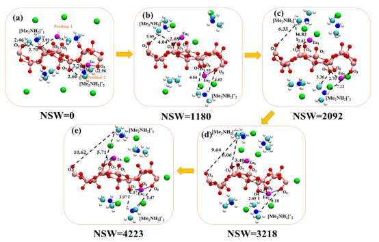 進一步地通過密度泛函理論計算的靜態幾何優化和分子動力學模擬,并結合XPS、EXAFS、Raman 光譜研究揭示了選擇性吸附機理。采用靜態幾何優化和基于 DFT 的分子動力學模擬研究了 Eu3+與 之間的相互作用。在原子水平上證實了 Eu3+ 與釩酸鹽層間強的相互作用和層間 [Me2NH2]離子的可交換性。并且通過計算取代能得出了選擇性交換鑭系元素的原因,取代能 Eu-O (4.35 eV)明顯高于 Sr-O(2.87 eV)和 Na-O(0.14 eV)。XPS 譜清楚地證明了 Eu3+ 或 Sm3+ 在交換后產物中的存在,并且通過比較吸附前后的 N 1s 峰(XPS)和EA,可以明顯地看出大部分 [Me2NH2]離子被 Eu3+ 或 Sm3+ 離子交換。EXAFS 分析表明 Eu3+ 離子與釩酸鹽層 O 原子之間存在相互作用,而 Ram