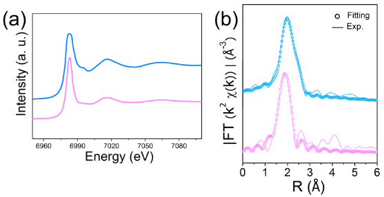 ▲Figure S7. The normalized Eu K-edge XANES spectra of EuCl3·6H2O (blue line) and 1-Eu (red line) (a); Fourier transform EXAFS spectra and corresponding EXAFS fitting curves of EuCl3·6H2O (blue line) and 1-Eu (red line) (b).