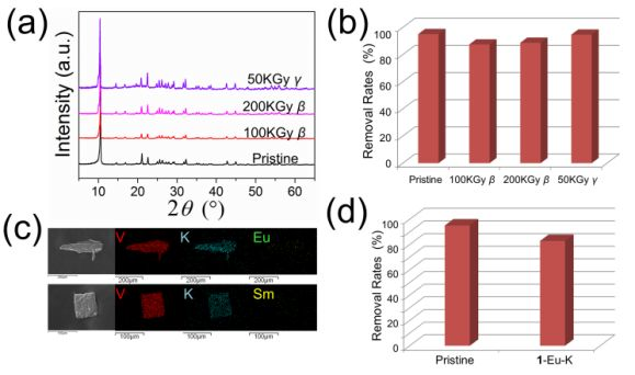 ▲Figure 5. PXRD patterns (a) and removal rates for Eu3+ (b) for the β and γ-irradiated samples compared with the pristine 1. (c) SEM images of eluted 1-Eu and 1-Sm with KCl solutions, and corresponding elemental distribution maps of V, K, Eu and Sm. The elemental distribution mapping shows that K+ distribution is homogeneous in the samples. (d) Eu3+ removal rates for the pristine 1 and 1-Eu-K.