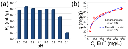 ▲Figure 3. (a) Kd values of Eu3+ removal by 1 at various pH values from 2.0 to 8.1. (b) Equilibrium data for Eu3+ adsorption of 1 fitted with the Langmuir and Freundlich isotherm models at pH = 2.5.