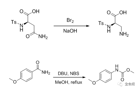最早期的Hofmann降解是使用NaOH水溶液和Br2來實施的。這個條件比較 劇烈,后續有許多改進的方法陸續被報道,主要是通過改進氧化劑和 堿。如Keillor等人1997年報道了用NBS做氧化劑,DBU做堿,甲醇中回流 25分鐘就得到了甲氧羰基保護的胺(JOC, 1997, 62, 7495-7496)。