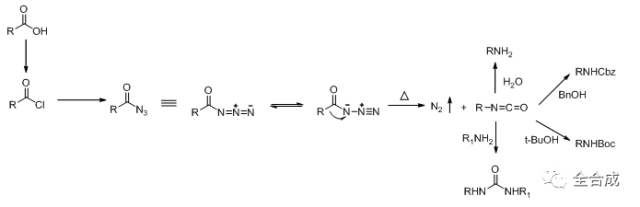 其反應機理為:首先酰氯被轉化為酰基疊氮,其 加熱重排脫去一分子氮氣后得到相應的異氰酸酯,異氰酸酯水 解或和其他親核試劑反應得到胺及相應的衍生物。早期的合 成方法都是將酸轉變為相應的酰氯,再生成酰基疊氮。