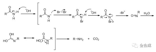 Hofmann降解是將伯酰胺通過氧化降解成少一個碳原子的伯胺, 其機理如下: