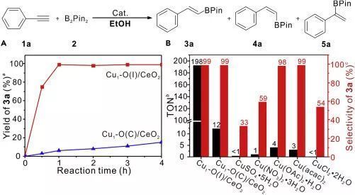 研究人員通過考察兩個單原子位點Cu催化劑在無添加劑條件下的選擇性炔烴硼氫化反應(yīng)中的性能表現(xiàn)時發(fā)現(xiàn),具有強極性Cu-O鍵的Cu1-O(I)/CeO2催化劑體現(xiàn)出明顯高于具有弱極性Cu-O鍵的Cu1-O(C)/CeO2催化劑的催化活性。通過制備的Cu1-O(I)/CeO2催化劑,研究人員能夠?qū)崿F(xiàn)不同類型炔烴底物在無添加劑條件下的高效、高選擇性硼氫化反應(yīng),生產(chǎn)出重要的有機合成中間體-烯基硼酸酯類化合物。