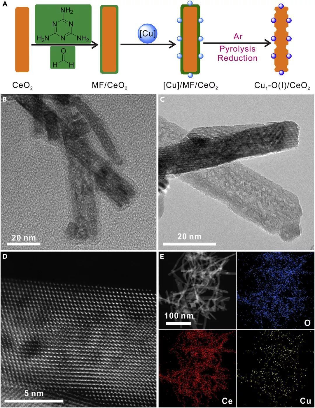 圖1:Cu1-O(I)/CeO2合成路線圖和相關(guān)電鏡表征