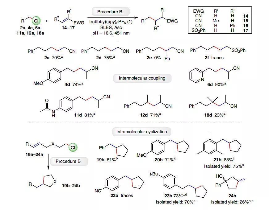 此外,作者設想將烷基氯化物的活化應用于分子間C-C鍵的形成。以碳為中心的烷基自由基具有親核性,可以與親電試劑發生反應。因此,作者選擇了缺電子的烯烴與其進行Giese型偶聯反應。與脫鹵方案相比,烯烴的加入明顯影響了反應活性和微結構溶液的組成。因此,以丙烯腈(14)為底物,對反應條件進行了優化,結果表明相對較高的pH值提供了所需濃度的L-抗壞血酸二價陰離子,反應在451 nm和400 nm兩種LEDs照射下進行,而在綠光下不進行,同時更高的光照強度會加速反應的進行。