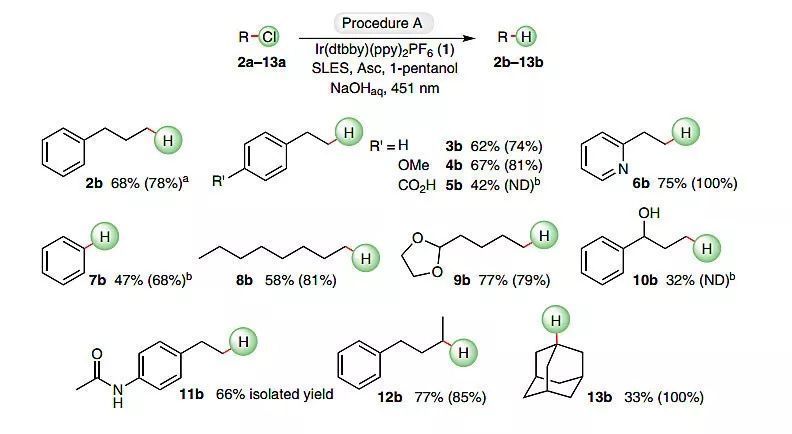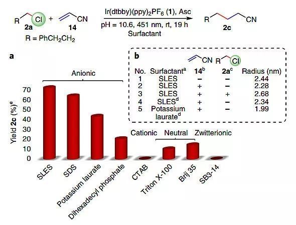 為了驗證烷基氯化物在設計的體系中優先被還原的假設,作者將(3-氯丙基)苯(2a)作為反應的底物,Ir(dtbby)(ppy)2PF6(1)作為光催化劑,SLES和L-抗壞血酸水溶液作為還原劑。在優化的反應條件下,21 h后2a的轉化率為76%,并且以60%的收率得到還原脫氯產物2b。控制實驗表明,光照、光催化劑和SLES都是反應必不可少的條件;作為電子供體的抗壞血酸同樣也是不可或缺的。反應時,肉眼能夠觀察到2a的充分溶解,動態光散射(DLS)實驗也進一步證實了這一點。相反,在沒有1-戊醇作為助表面活性劑的情況下,反應會產生渾濁的混合物,烷基氯化物的溶解度有限,從而大大降低了收率。先前報道表明在有機溶劑條件下并不能有效地還原烷基溴化物,這進一步證明了微非均相環境對此反應的重要性。