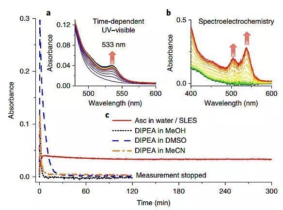 在分子內的偶聯反應中,烷基氯和烯烴都可能被還原,為了對這一過程進行研究,作者設計了氯化物25a的自由基鐘反應(圖6b),主要產物環戊基丁腈25b的生成表明25a生成了自由基,經過5-exo-trig環化反應后被丙烯腈14捕獲。此外,作者還進行了氘標記實驗(圖6c),反應以氘水為溶劑,它既是很好的氘陽離子來源,又是弱氘原子的供體。氯化物4a的脫鹵反應得到了4b和4c的混合物,其中4c含有52%的氘。由于β-位的自由基反應活性高且不穩定,因此C–D鍵的形成可能是通過DAsc物種的氘原子轉移(DAT)機制,其在反應混合物中原位形成。其余48%的氫來自于具有長烷基鏈的(共)表面活性劑。與4a相比,氯化物2a和20a生成的自由基具有更高的穩定性和更低的負還原電位,使得它們更容易被二次還原,得到完全氘代的產物2g和20c。然而,在這種情況下,也無法排除存在部分DAT途徑。Ir(dtbby)(ppy)2PF6在混合膠束中的光譜與在DMSO中相比,具有更短的熒光壽命和更低的發光強度,并且最大紅移為23 nm。