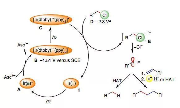 Burkhard K?nig課題組通過APSET系統在可見光誘導條件下對高還原電位的烷基氯化物進行了活化。水膠束溶液通過非共價鍵的相互作用和反應物質的隔離來穩定[Ir(dtbby)?-(ppy)2]絡合物,這種方法在烷基氯化物脫鹵、加成和環化反應中具有潛在的應用價值。機理研究表明,該反應以conPET的方式利用了兩個光子的能量。該結果為非活性氯化物作為烷基自由基源在有機合成中的應用開辟了新的道路。