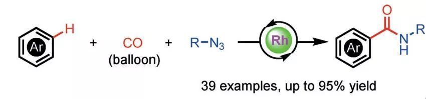 作者使用商業化的銠鹽或鈀鹽為催化劑、常壓下的CO作為羰基源、有機疊氮化合物作為氮源,實現了富電子(雜)芳烴的碳—氫酰胺化反應。作者首先以N-甲基、芐基、或苯基吲哚為底物,反應均能以優秀的收率得到目標化合物,當使用N上無保護基團的吲哚為底物時,反應也能夠以優秀的結果得到目標產物。最后作者考察了吡咯、甘菊藍、二甲基苯胺等一系列芳烴對反應的耐受性,發現反應在銠和鈀的催化下均表現出較高的反應活性。該反應首次通過金屬氮卡賓中間體實現了分子間碳—氫羰基化,氮氣是唯一副產物,且具有原料易得、反應簡單、條件溫和、綠色高效等優點。