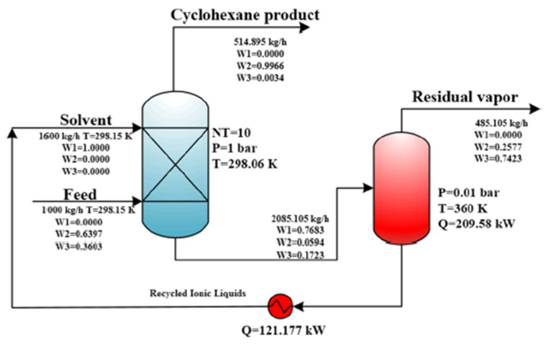 圖3. 以[Bmim]OTF為溶劑分離TBA和環(huán)己烷的萃取工藝流程