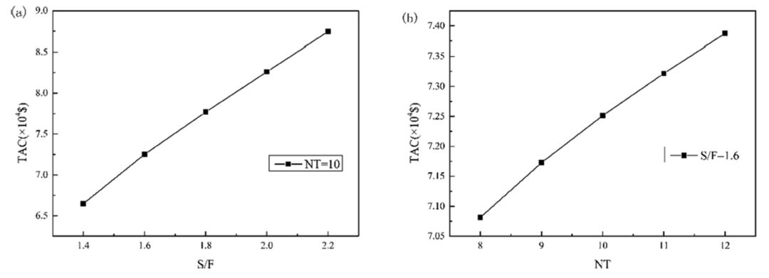 研究人員通過(guò)設(shè)計(jì)一定的工藝流程,以至少99.50 wt%的純度和至少98.0%的TBA的高回收率獲得環(huán)己烷產(chǎn)物。以[Bmim]OTF為萃取溶劑,顯示了不同級(jí)數(shù)下的環(huán)己烷產(chǎn)物的純度和TBA與S/F的回收率。顯然,環(huán)己烷產(chǎn)物的純度和TBA的回收率隨著S/F或階段的增加而提高。與此同時(shí)研究人員對(duì)在一定條件下的運(yùn)營(yíng)成本也進(jìn)行了計(jì)算,提出了最優(yōu)的S/F=1.6(A4)條件下該流程最具有經(jīng)濟(jì)性。