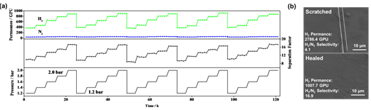 Figure 3. (a) Pressure swing stability of the UPC-HOF-6-120 membrane, (b) Top-view SEM images and separation performance of scratched membrane and healed membrane.
