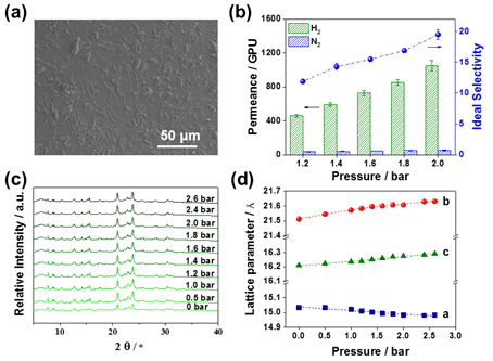 Figure 1. (a) Top-view SEM of UPC-HOF-6-120 membrane. (b) Single gas permeation of UPC-HOF-6-120 membrane at 25 oC and varied trans-membrane pressure drop. (c) In-situ pressure-dependent PXRD for UPC-HOF-6. (d) Pressure dependent lattice parameters extracted from the PXRD patterns by Lebail fitting.