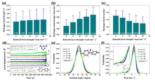 Figure 2. Averaged hydrogen bond (a) length, (b) energy and (c) number versus the external force strength on gas molecules. (d) Local displacements of two typical segments on UPC-HOF-6 versus the external force strength on gas molecules. (e) Distribution probability of included angle between adjacent benzene rings. (f) Distribution probability of pore size inthe channel.