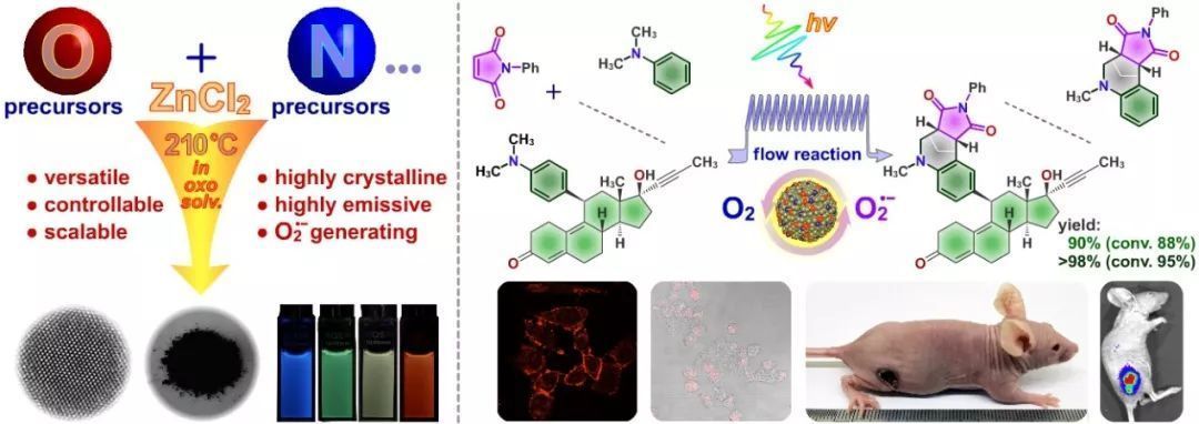 得益于獨(dú)特的硬核-軟殼結(jié)構(gòu),高結(jié)晶性發(fā)光碳點(diǎn)在可見光激發(fā)下能夠高效產(chǎn)生超氧陰離子自由基(O2?–),量子效率高達(dá)1.08%,在光動(dòng)力治療和光催化反應(yīng)等方面表現(xiàn)出色。一方面,發(fā)光碳點(diǎn)光毒性高和暗毒性低,對(duì)于腫瘤細(xì)胞體外實(shí)驗(yàn)和荷瘤小鼠體內(nèi)實(shí)驗(yàn)具有優(yōu)秀的光動(dòng)力治療效果;另一方面,發(fā)光碳點(diǎn)可見光響應(yīng)強(qiáng)和溶解性好,對(duì)于可見光催化的有機(jī)轉(zhuǎn)換具有顯著提升,借助微流控裝置,發(fā)光碳點(diǎn)10分鐘即可使模型藥物米非司酮的衍生化反應(yīng)產(chǎn)率達(dá)到90%。