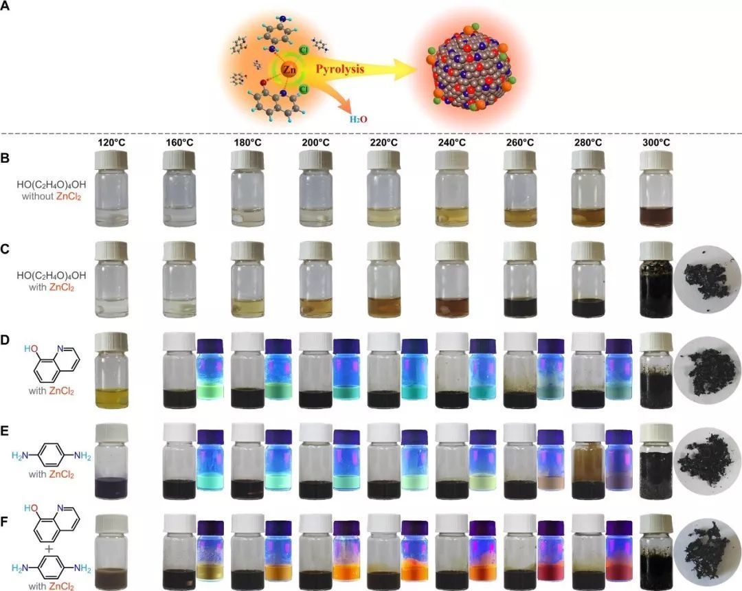 中國科學(xué)院理化技術(shù)研究所超分子光化學(xué)研究中心吳驪珠團(tuán)隊(duì)發(fā)展了高結(jié)晶性發(fā)光碳點(diǎn)的通用合成方法。研究人員利用低熔點(diǎn)ZnCl2在有機(jī)溶劑的溶解性和路易斯酸性,使含氧和氮元素的有機(jī)分子前體受熱脫水、碳化,在較低溫度下制備了系列熒光碳點(diǎn),從藍(lán)色到橙紅色發(fā)光碳點(diǎn)可通過有機(jī)分子前體的結(jié)構(gòu)和組合進(jìn)行調(diào)控。如圖1所示,當(dāng)單一8-羥基喹啉為前體時(shí)所得發(fā)光碳點(diǎn)為藍(lán)綠色,單一對(duì)苯二胺為前體時(shí)所得發(fā)光碳點(diǎn)為黃綠色,而以8-羥基喹啉和對(duì)苯二胺的組合為前體時(shí)所得發(fā)光碳點(diǎn)為橙紅色。由于ZnCl2易溶于乙醚等有機(jī)溶劑,高結(jié)晶發(fā)光碳點(diǎn)能夠通過簡單的沉淀-過濾分離純化,合成收率超過50%,并進(jìn)行克級(jí)的放量制備。